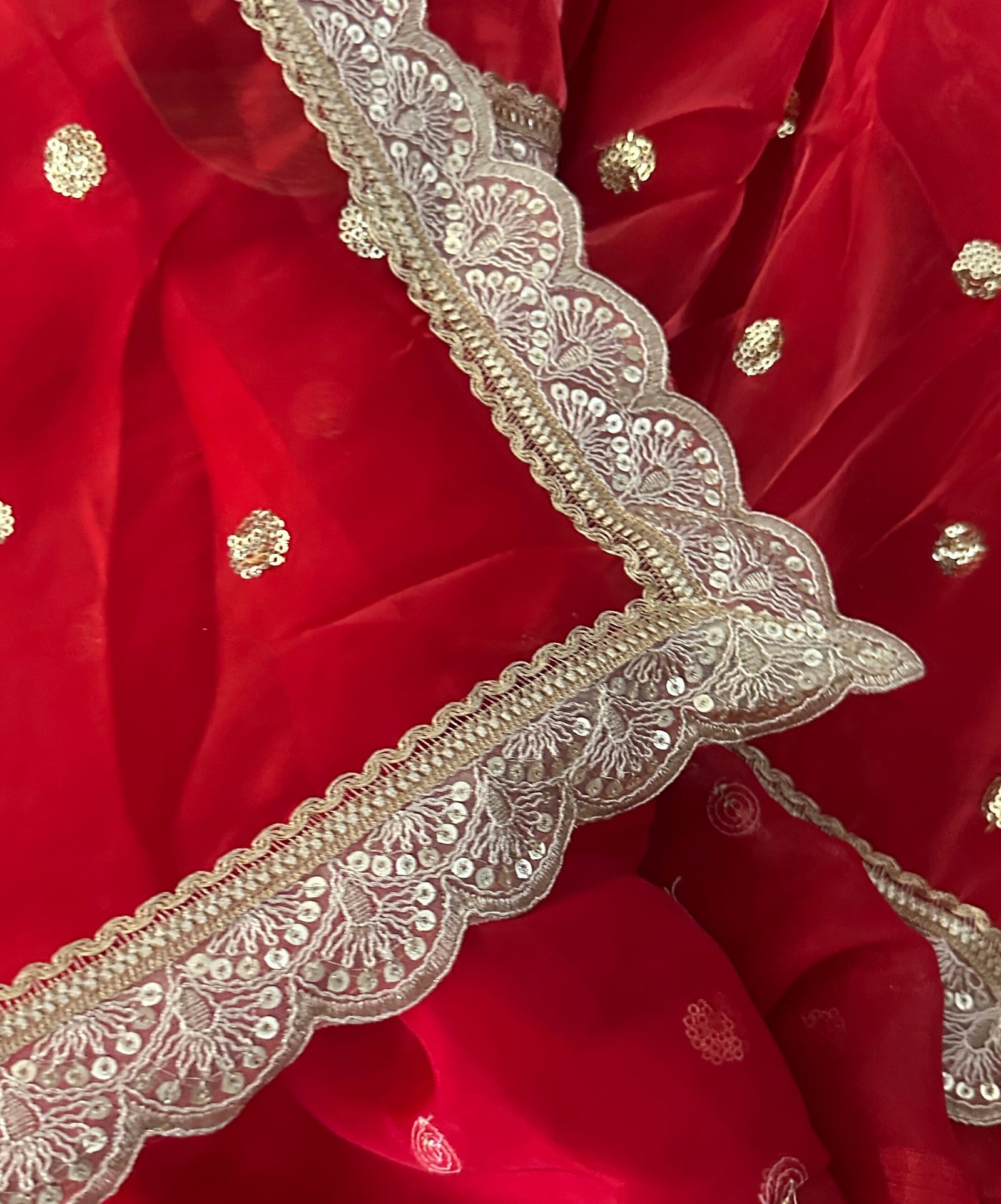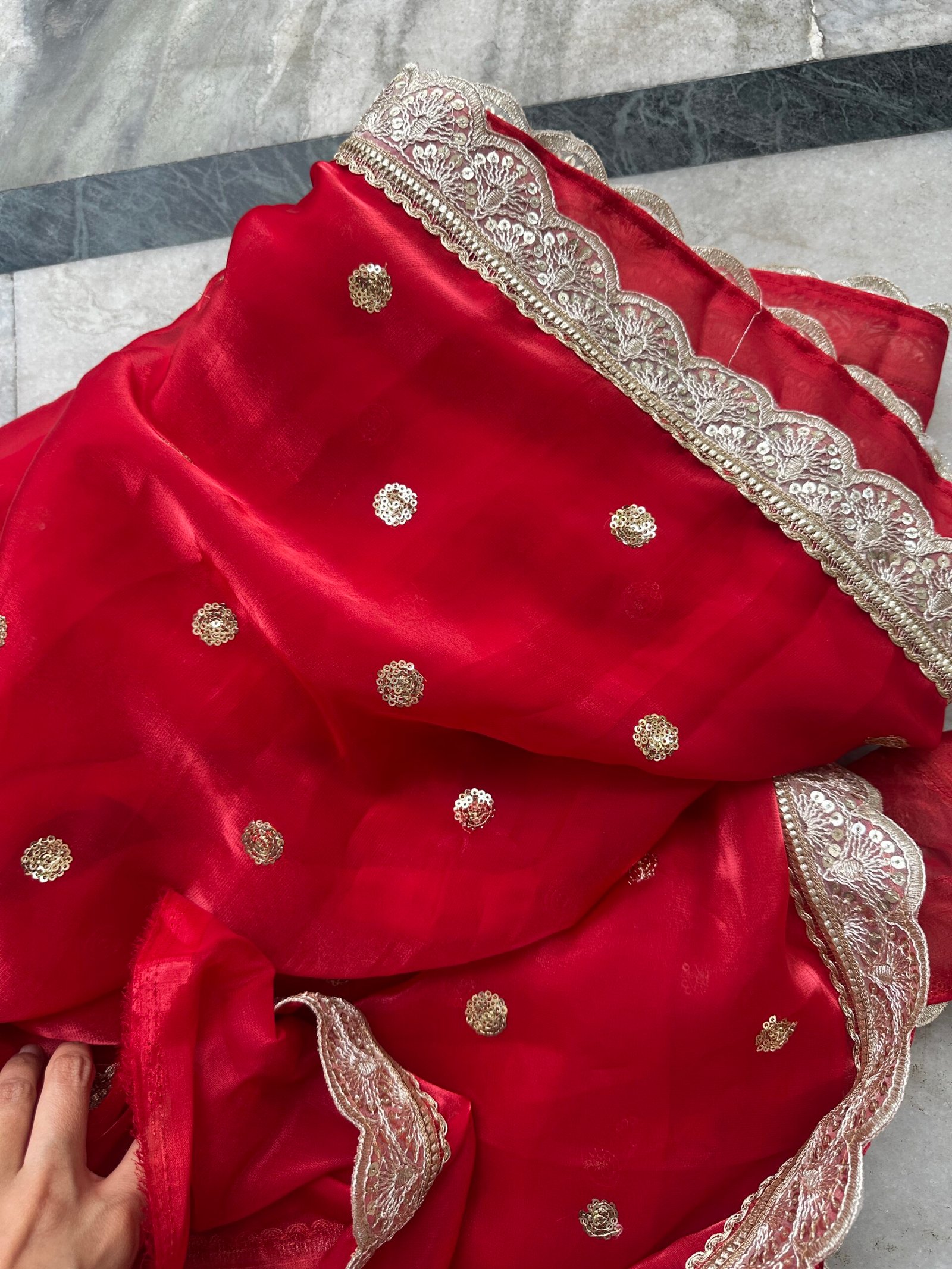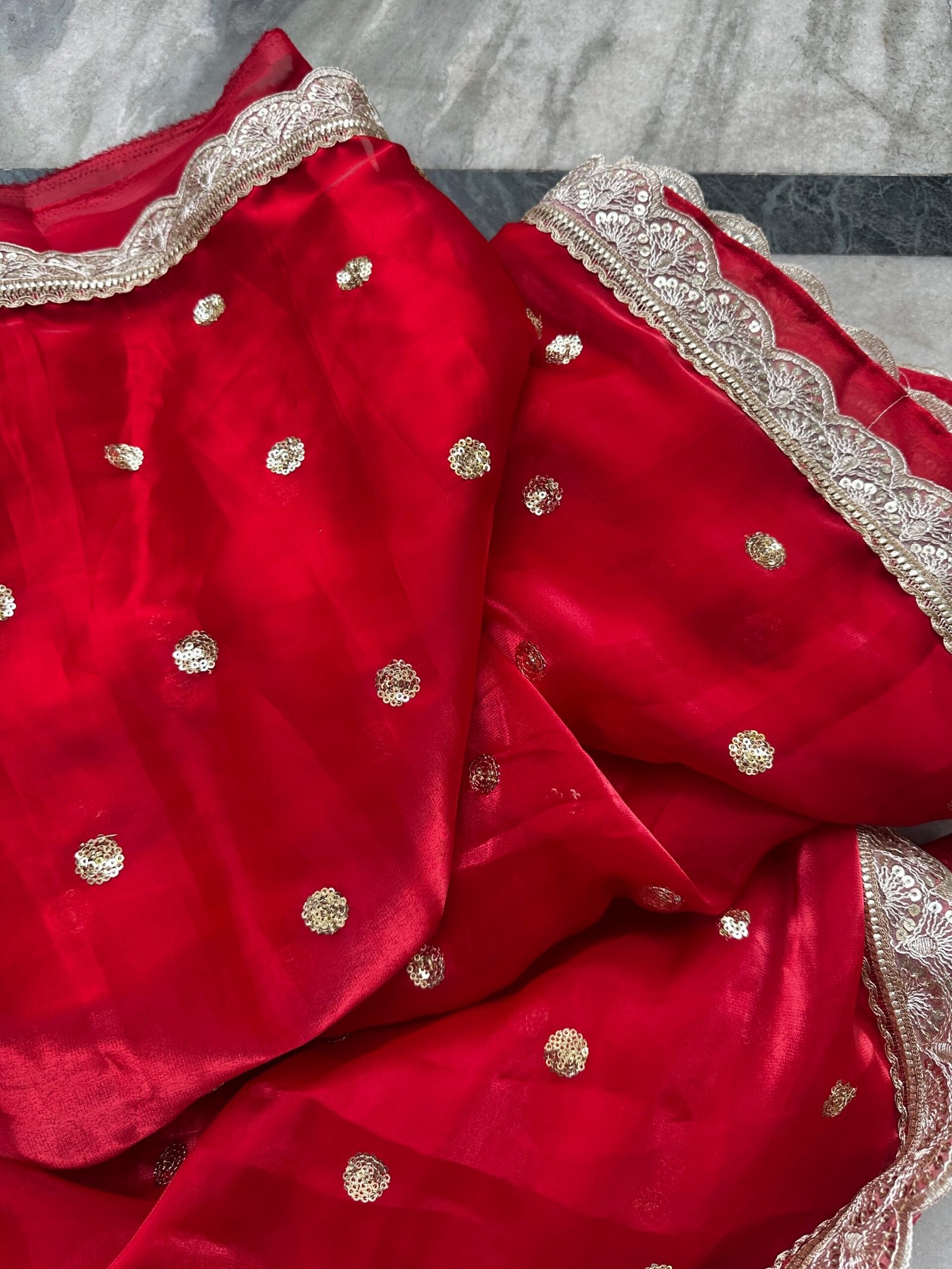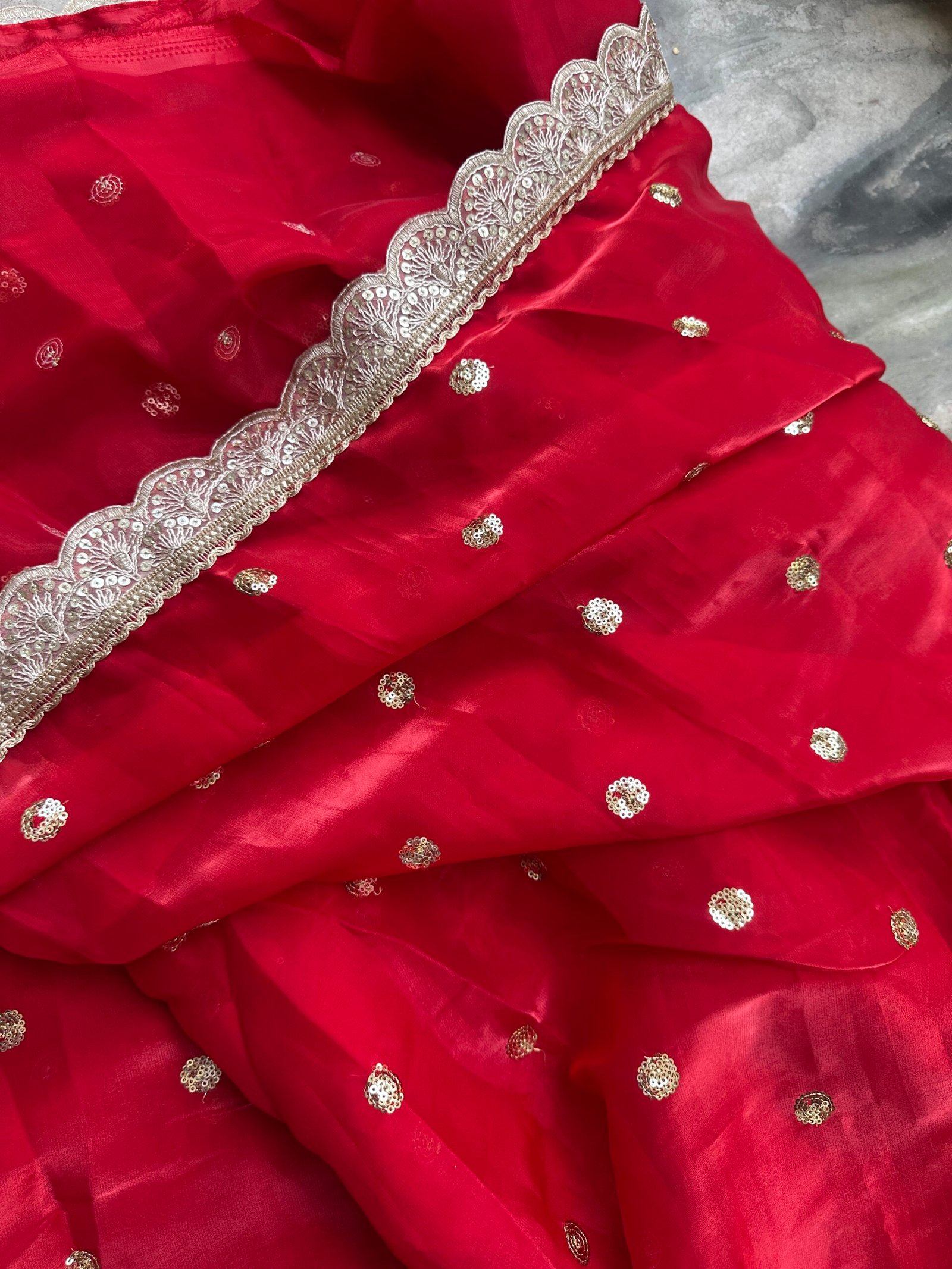 Embellished with dual laces all over the saree, it has sequence buti work on it, which makes it exquisite. Its glass tissue, soft and shining