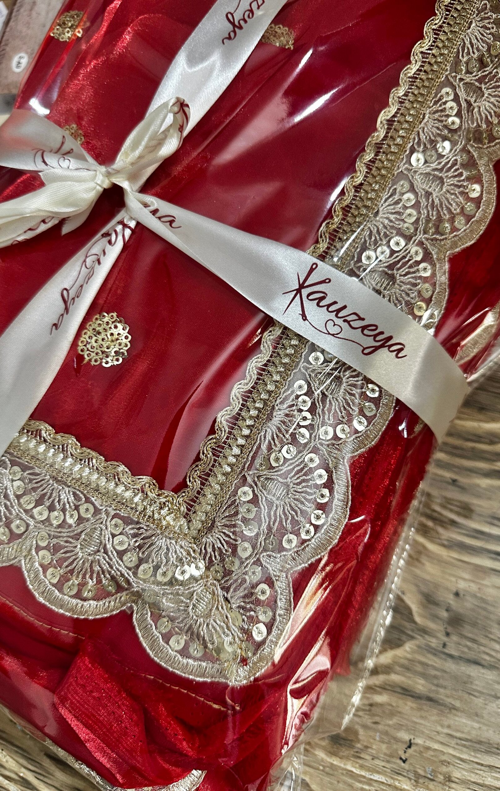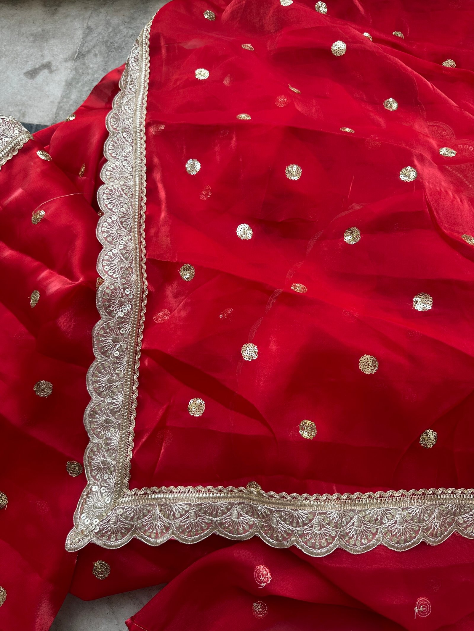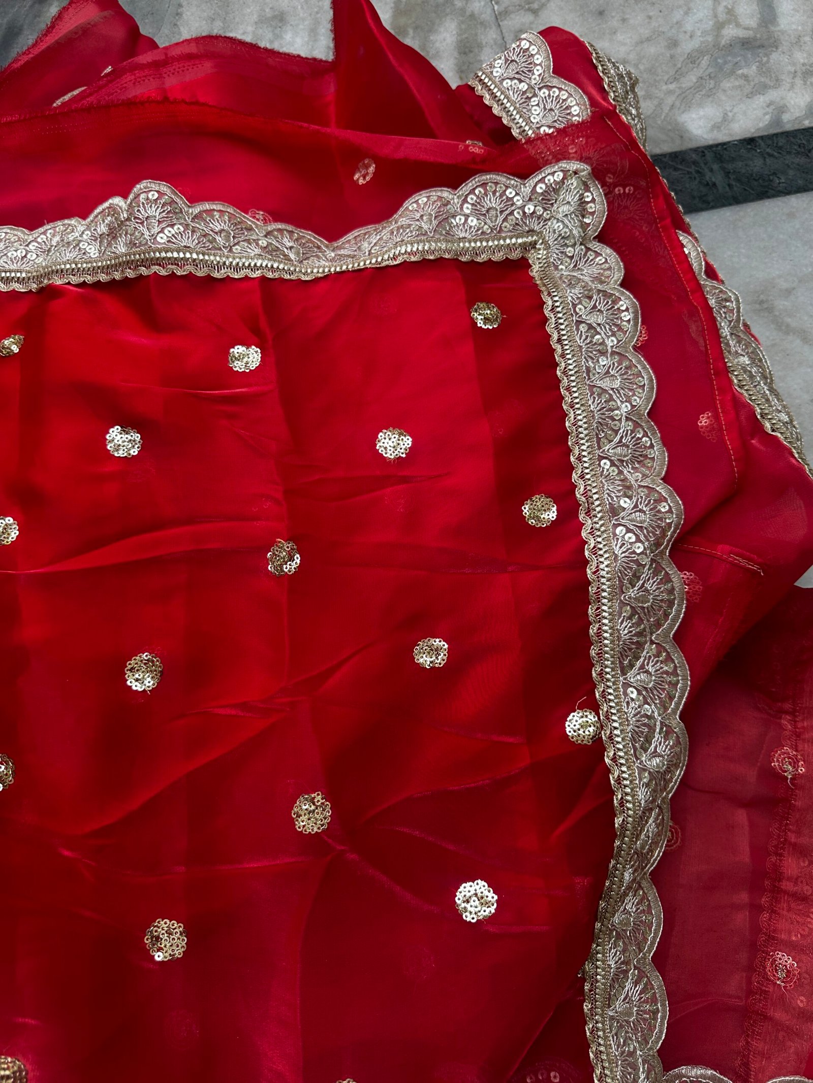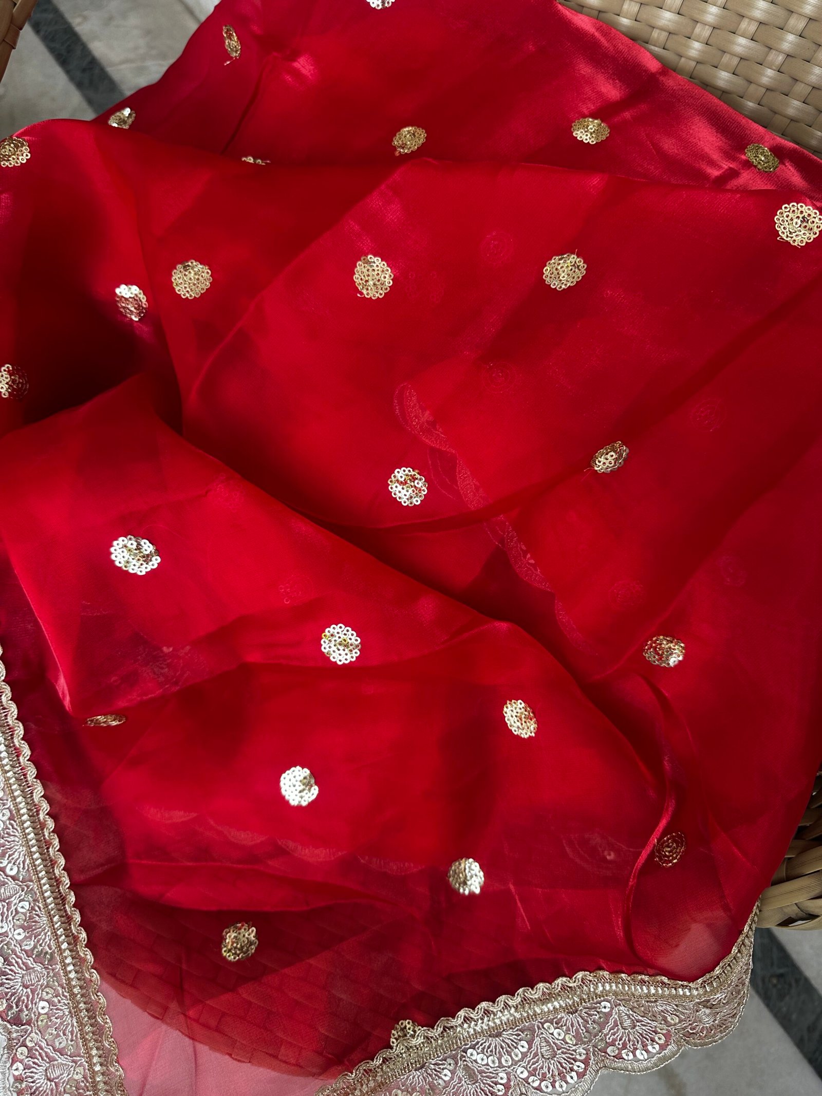 Embellished with dual laces all over the saree, it has sequence buti work on it, which makes it exquisite. Its glass tissue, soft and shining