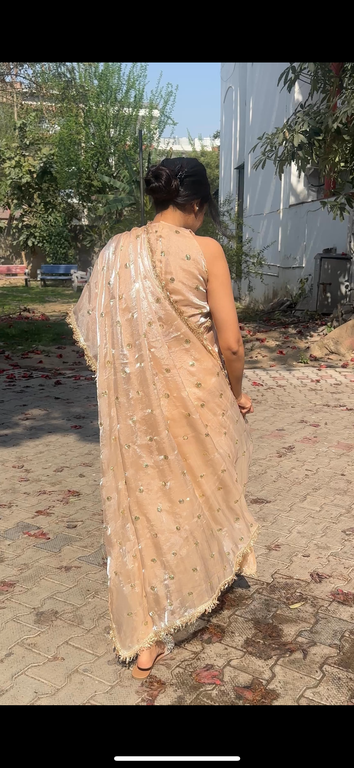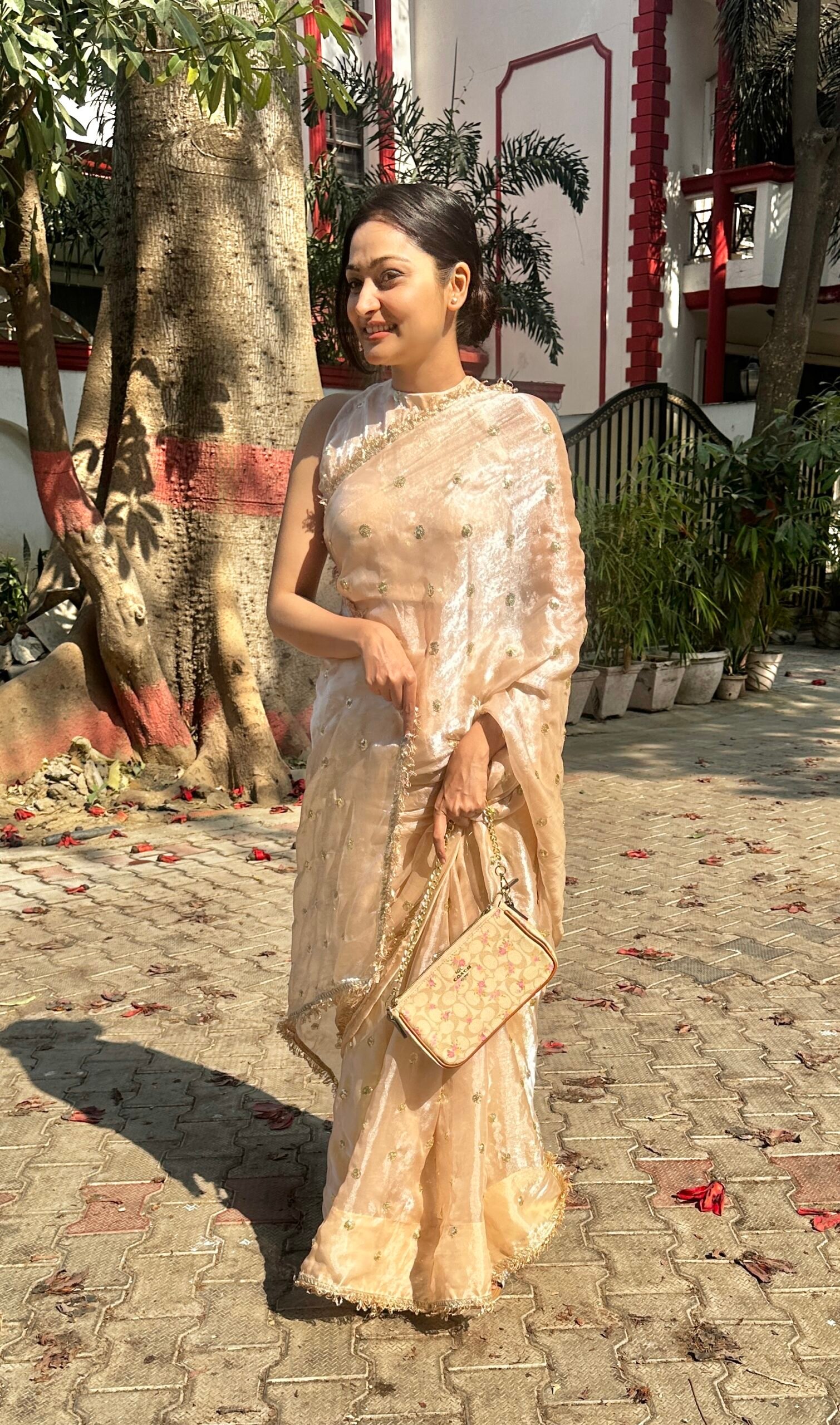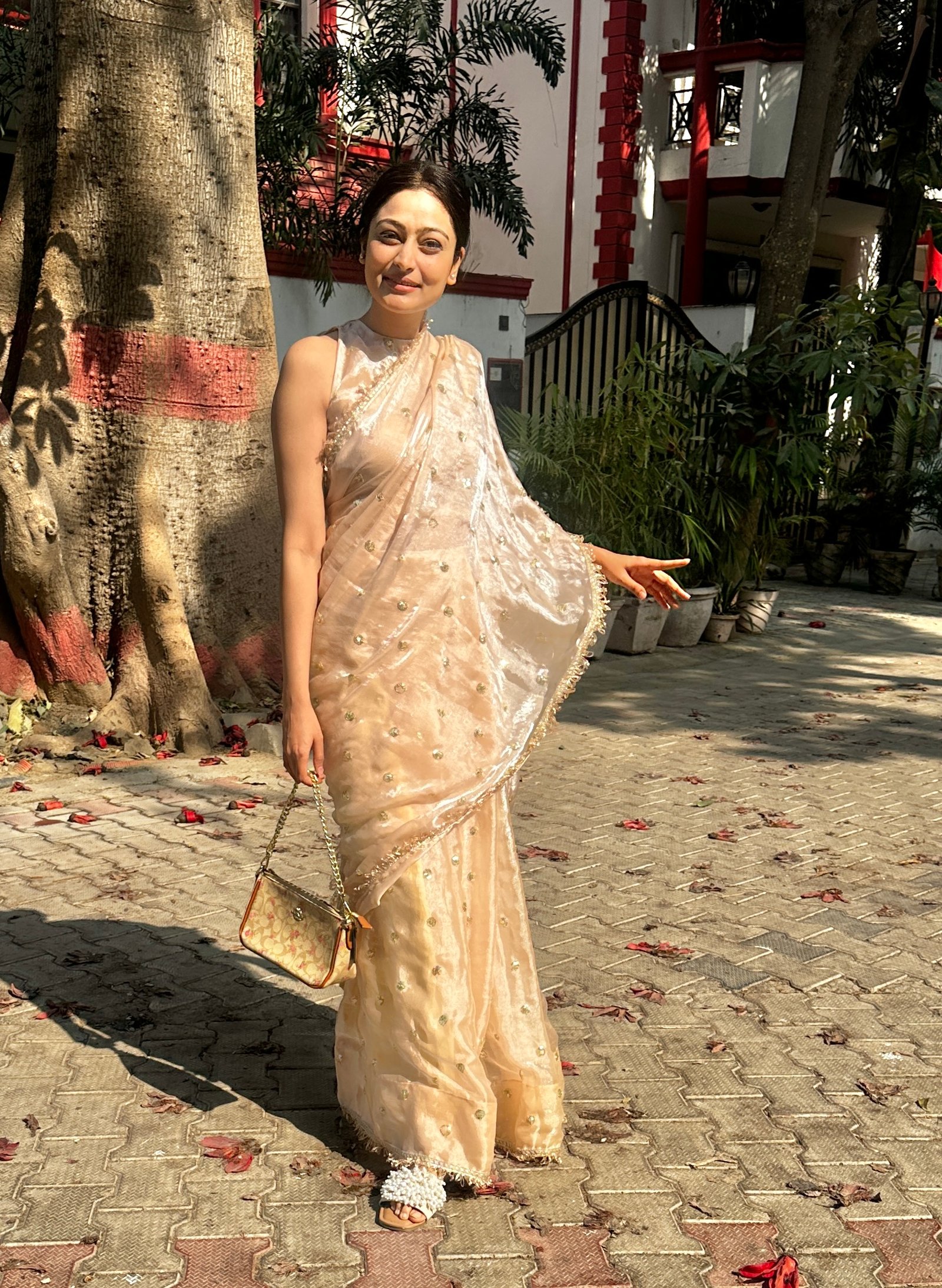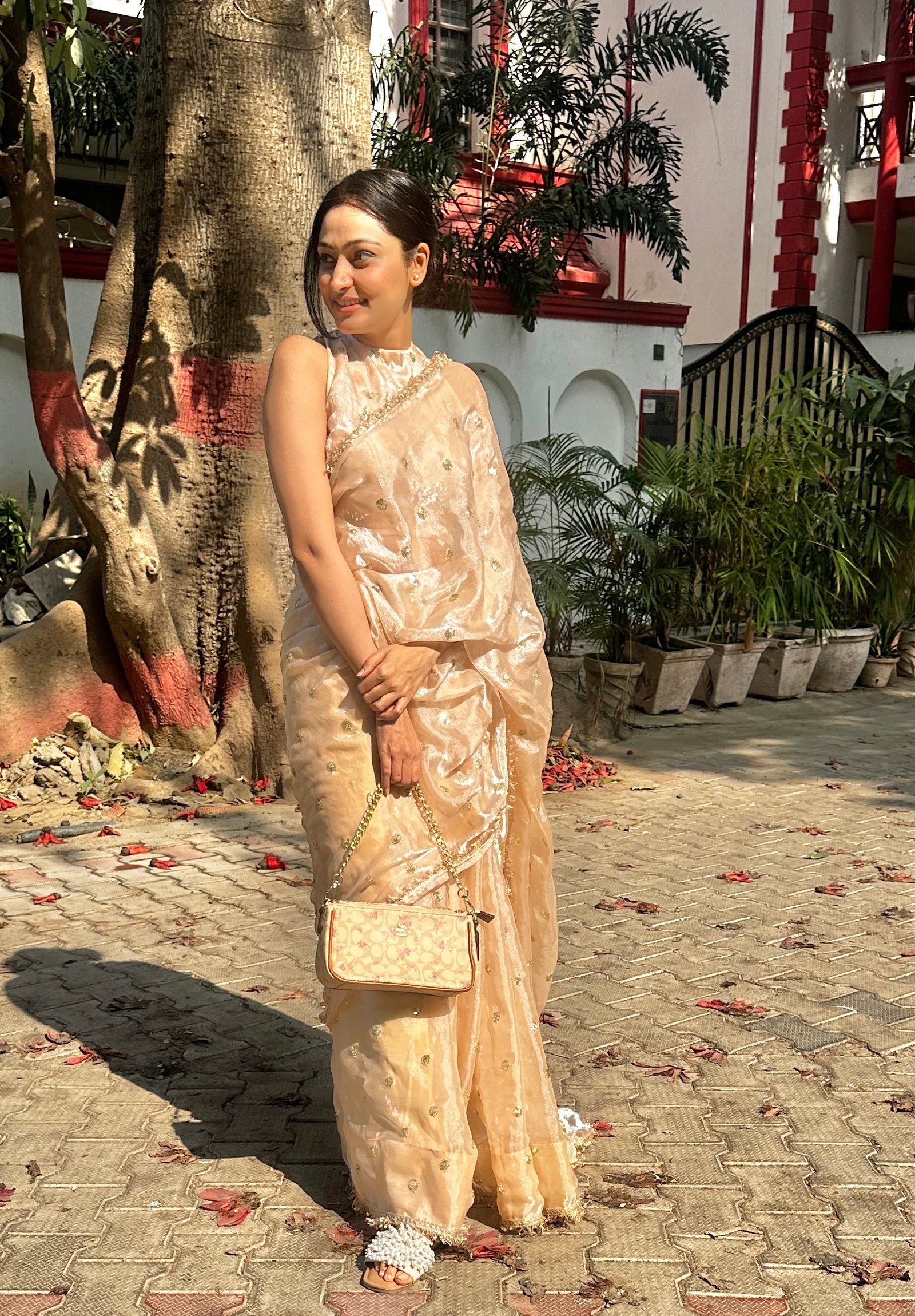 Champagne color tissue silk saree with buti work all over saree, embellished with gota all over saree. Shines so beautifuly in light, comes with Same blouse fabric of 1 mtr.