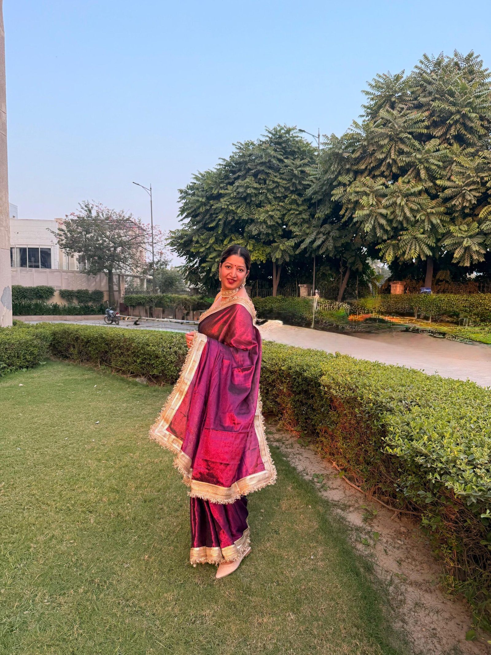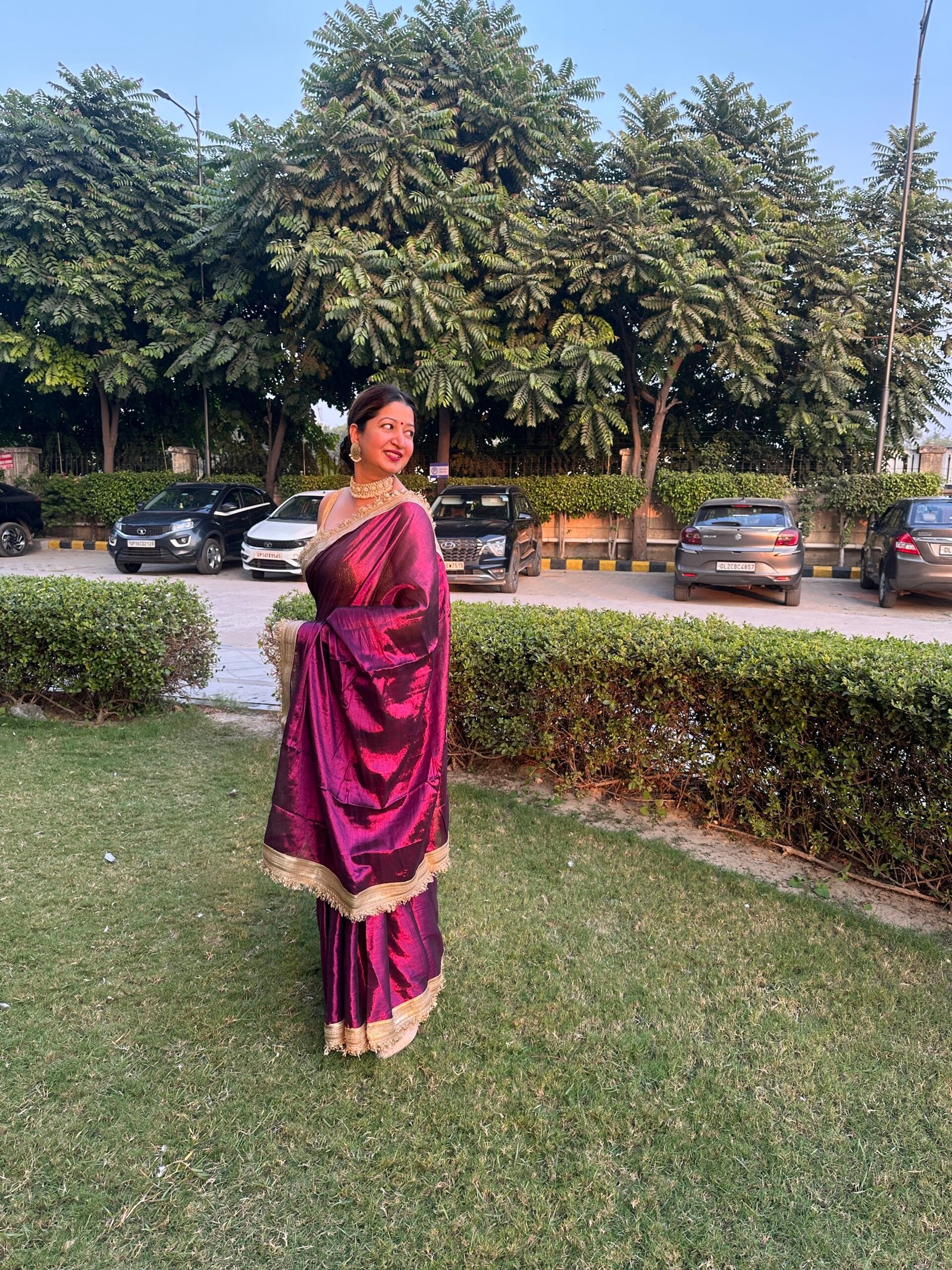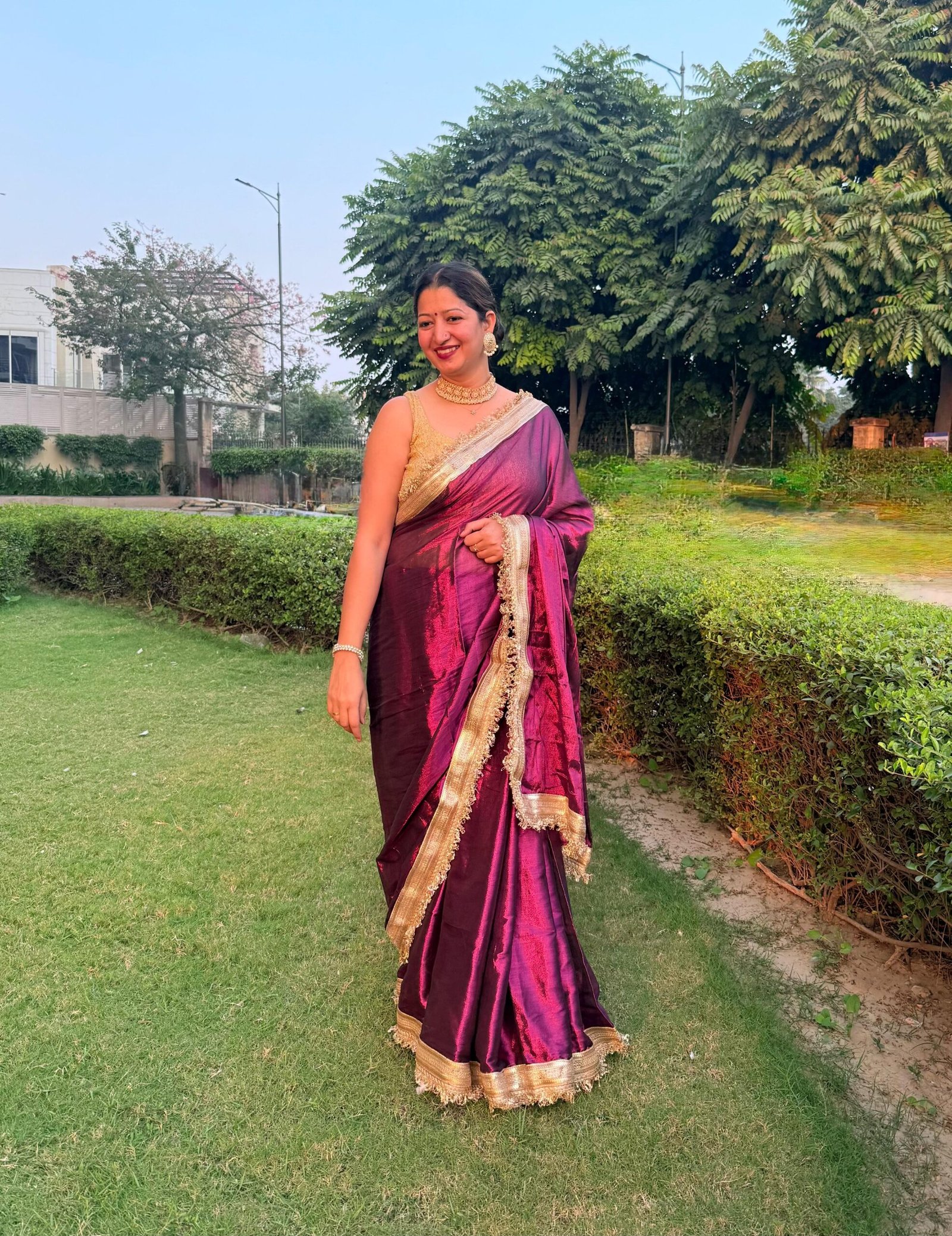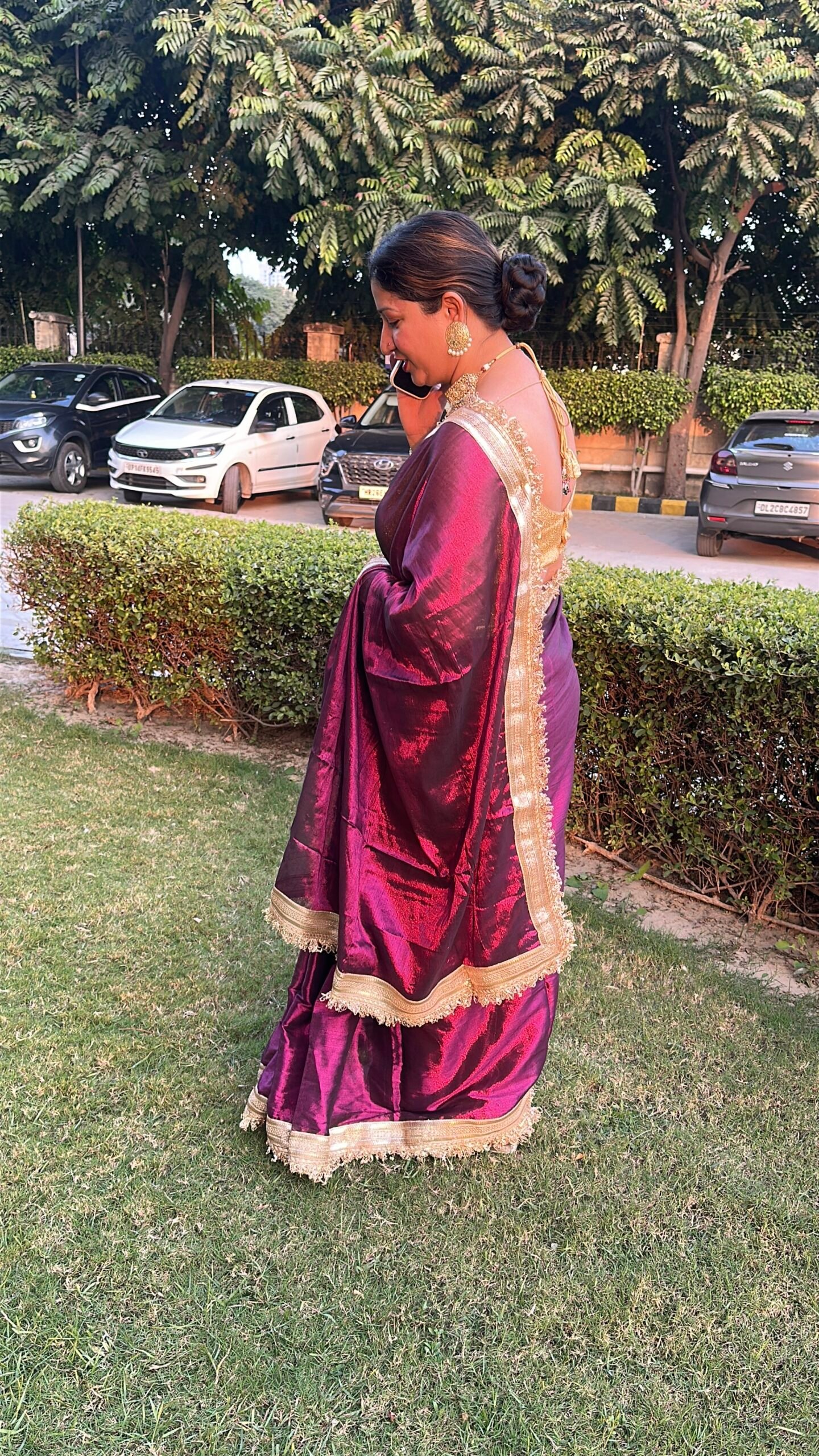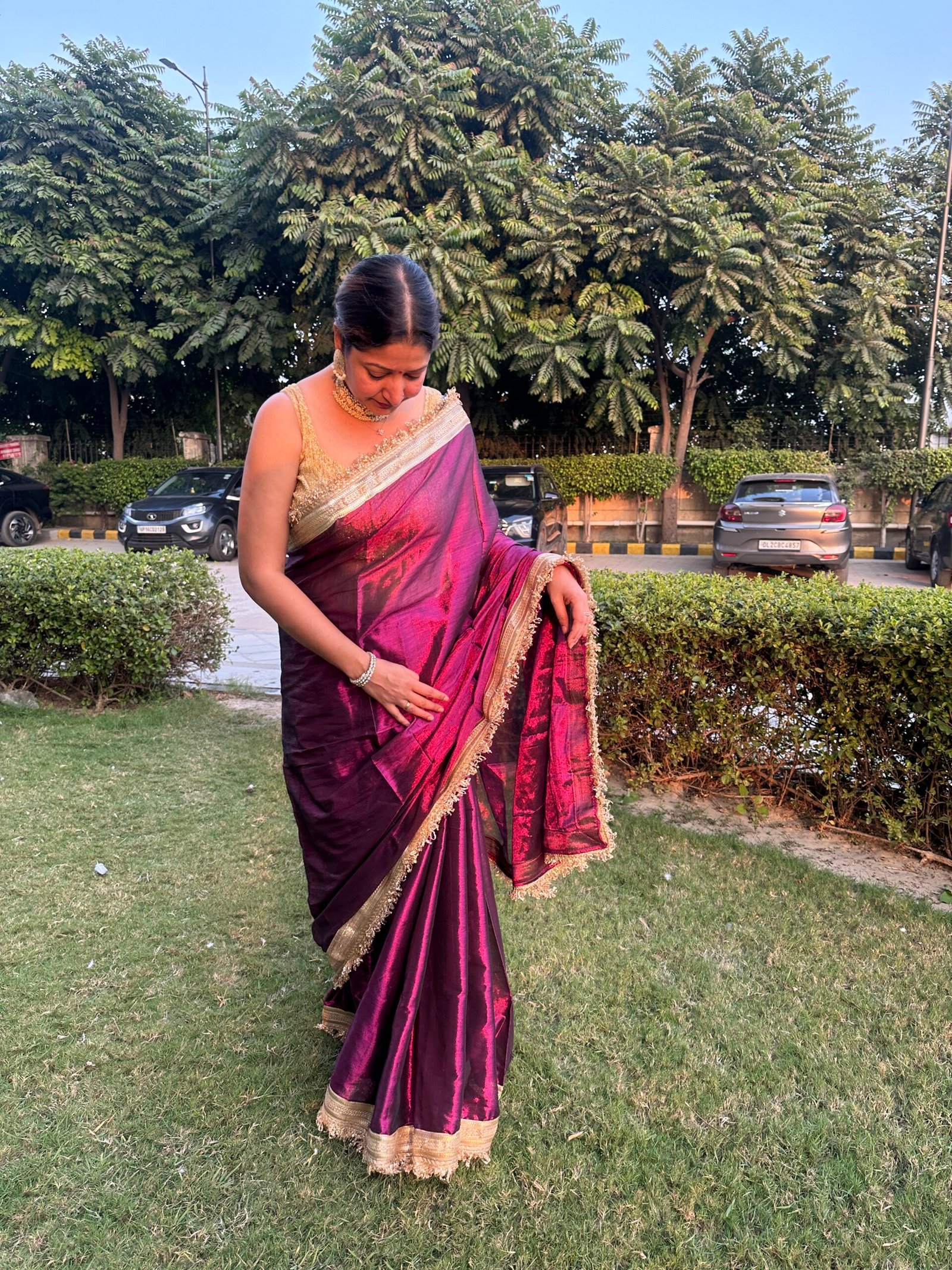 Pure handwoven tissue silk, dark purple color, the most royal color this season, embellished with dual laces of 4 inches.