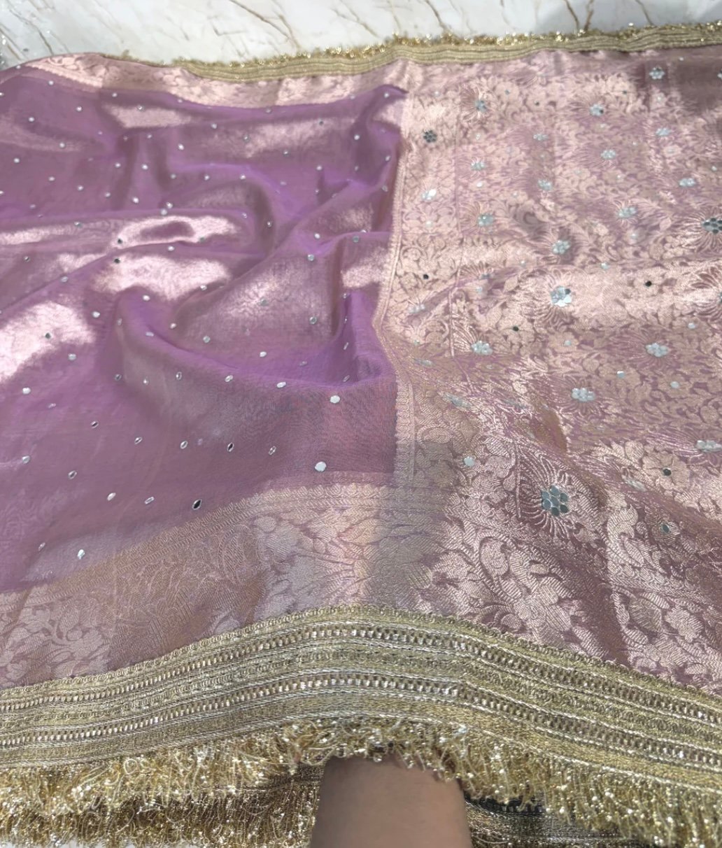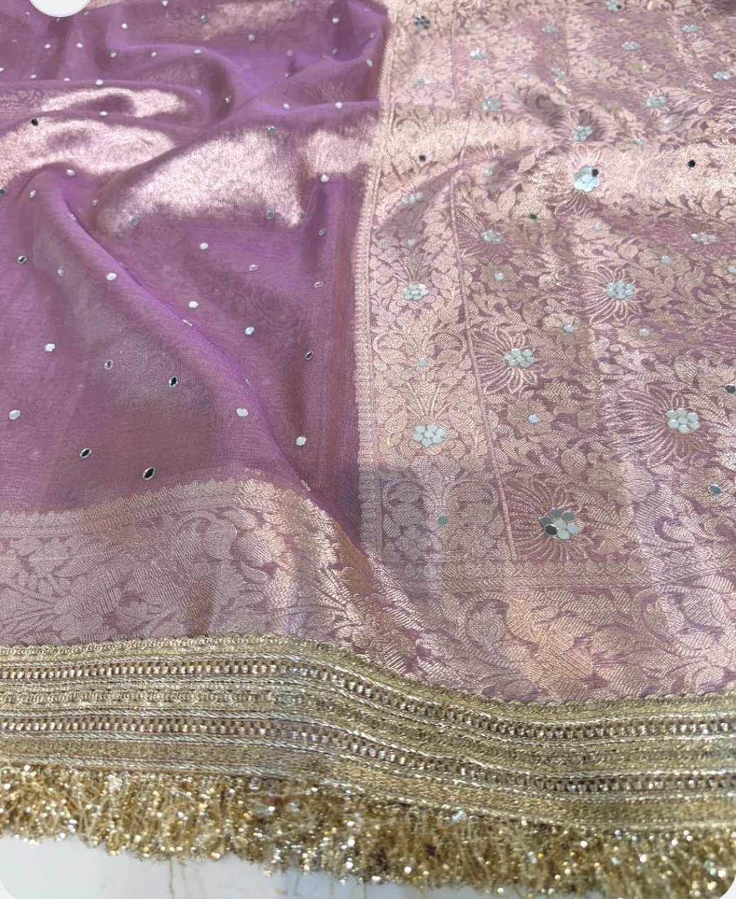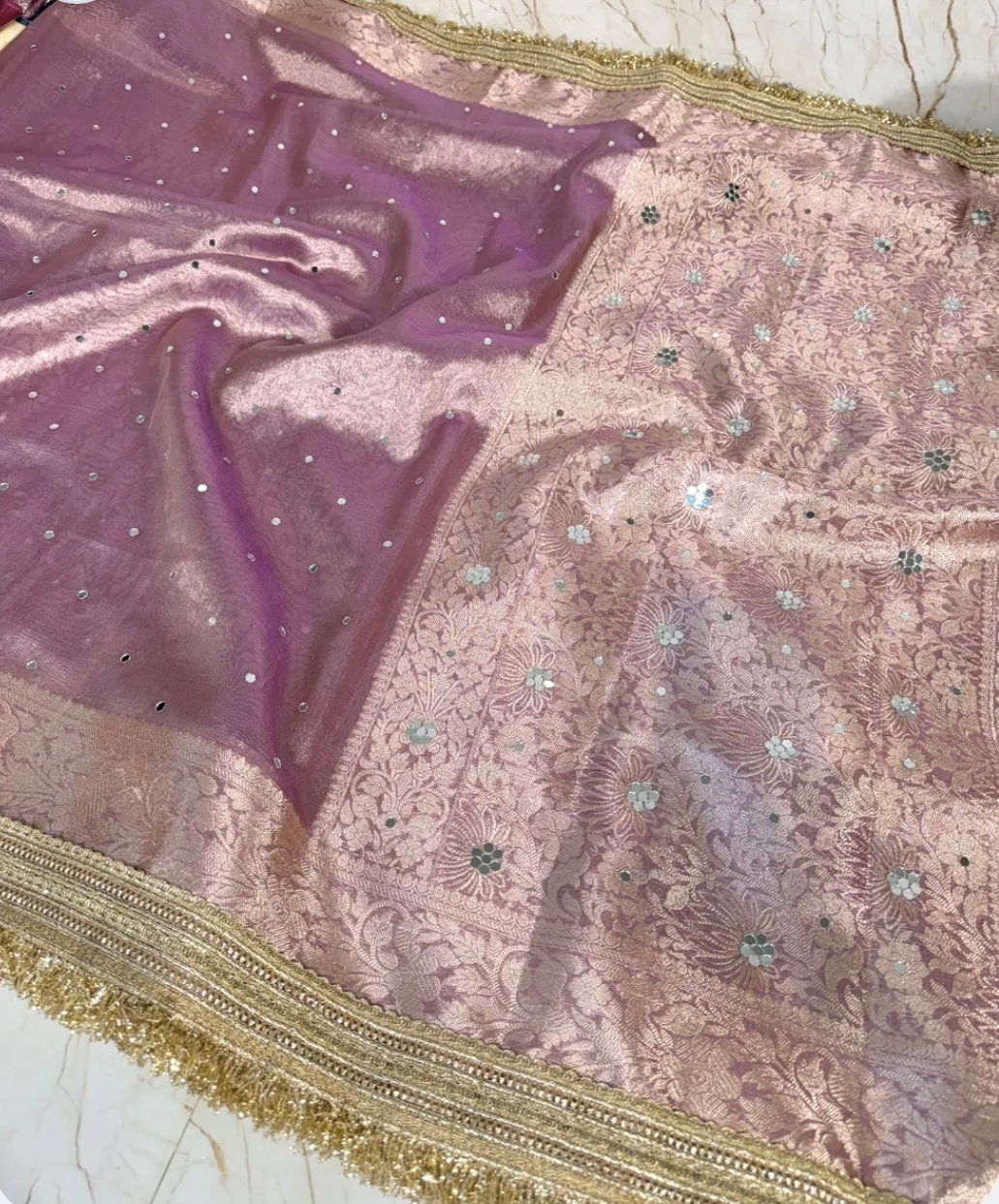 Pure tissue silk saree with heavy borders , embellished with laces and heavy pallu.